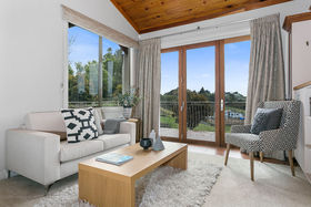 The generous balcony wraps around the living spaces, offering elevated views of the rolling country side, while the sun drenched deck is privately positioned, draped in lush greenery. The grounds are landscaped with low maintenance but striking plantings, an impressive waterfall and full post 'n' rail fencing of five paddocks. The property also offers a new barn with three stables.